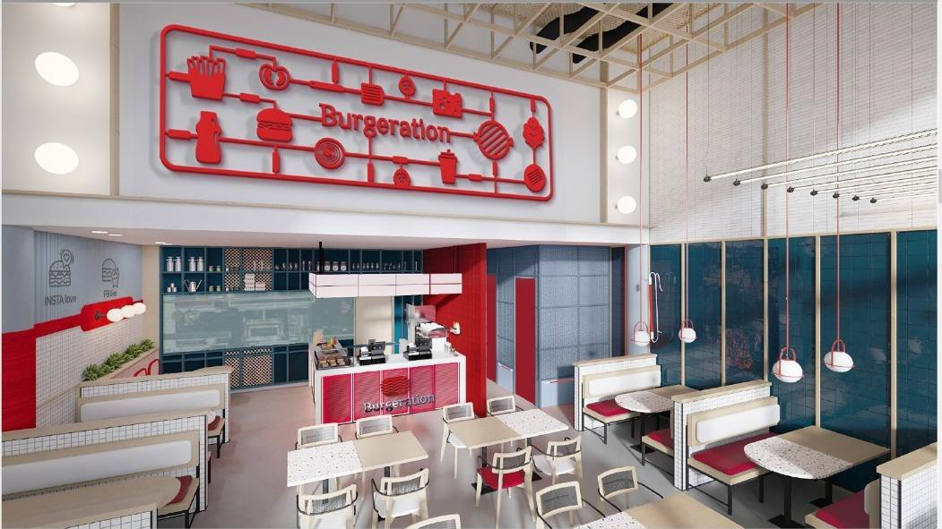 Complete restaurant interior concept and fit-out executed with branded finishes, seating, and wall features.